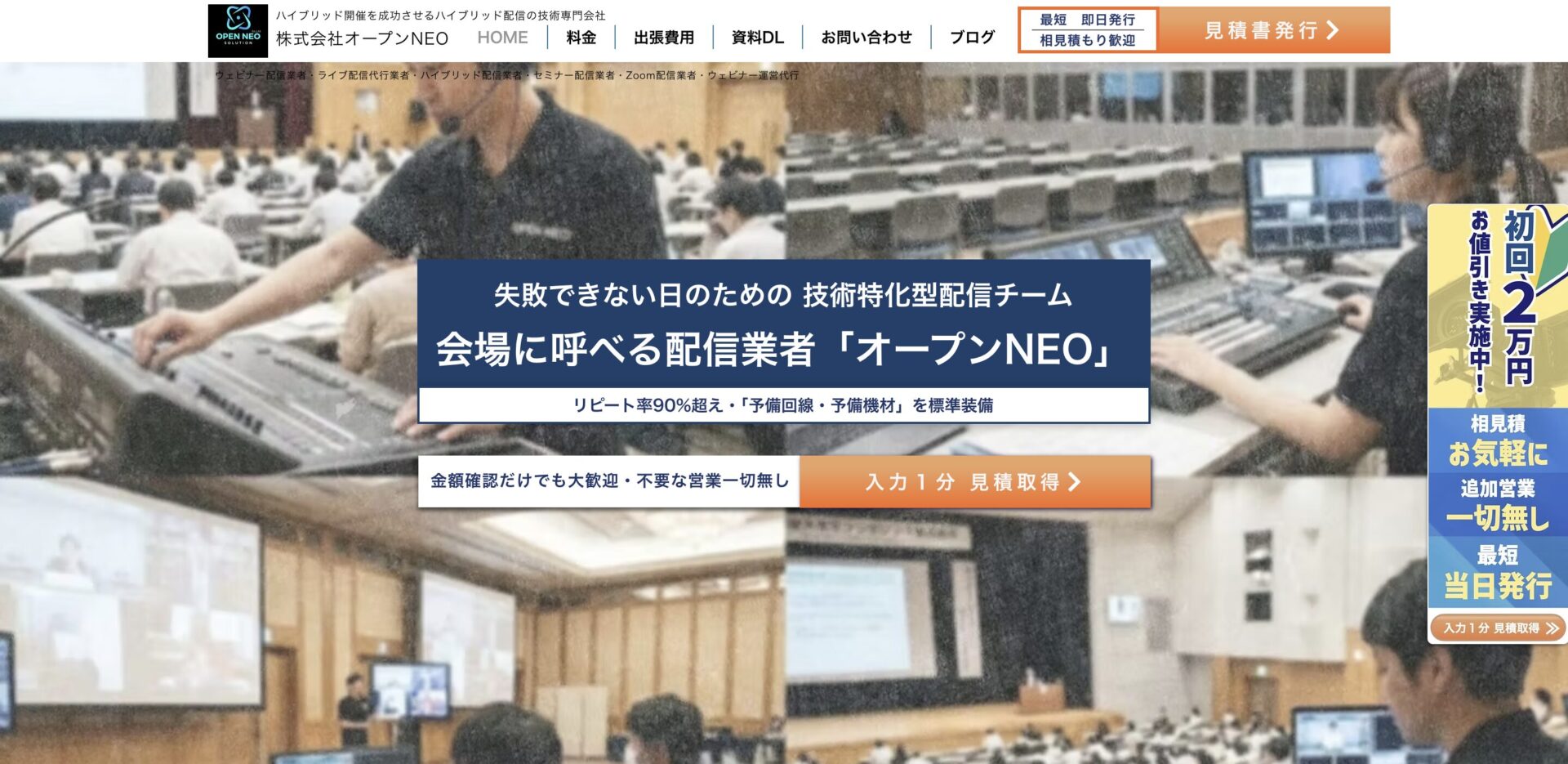 株式会社オープンNEOは、東京を拠点にハイブリッド配信・ウェビナー配信を専門とするイベント配信業者です。配信実績10年以上、年間200件以上の配信業務をこなすベテラン企業で、「ただ撮る・流すだけではない配信技術屋のこだわり」をスローガンに、映像・音声・音響・映像投影すべてを自社スタッフが一貫対応する体制が特徴です。 特に「音」へのこだわりが強く、ハウリング・エコー・ノイズなど視聴者離脱につながるトラブルを未然に防ぐための徹底した音響調整を強みとしています。また、予備回線・予備機材を標準装備しており、現場トラブルが発生した際も安定配信を維持できる設計です。