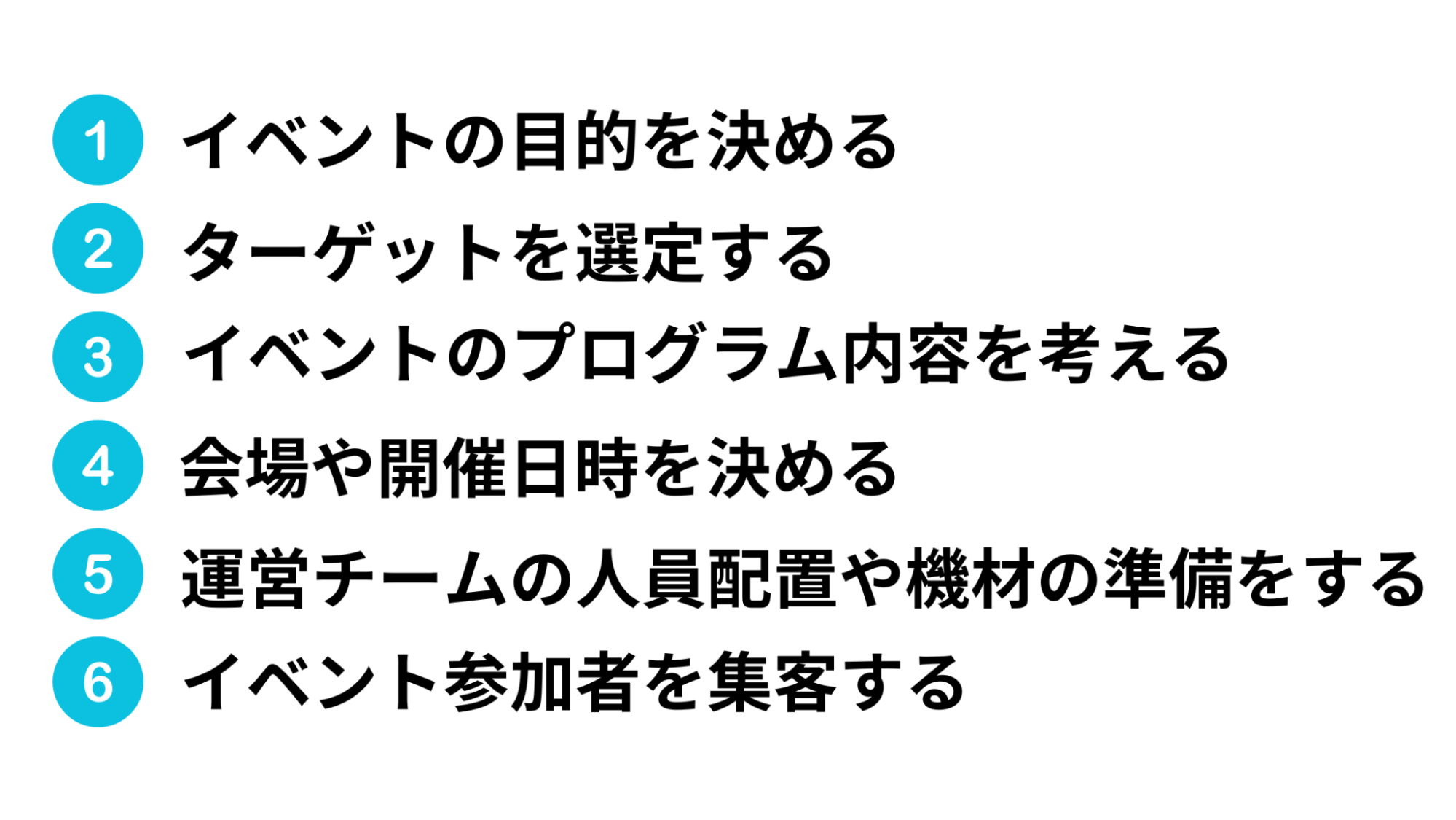 イベント企画は、以下の6つのステップに沿って進めるのが一般的です。それぞれについて詳しく解説します。