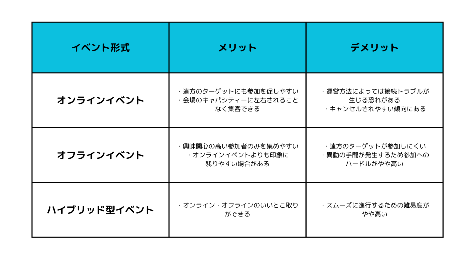 先述したとおり、イベントの形式は主にオンライン・オフライン・ハイブリッドの3種類があります。それぞれにメリット・デメリットがありますが、一度のイベントでより多くの参加者にアプローチしたい場合はハイブリッド形式がおすすめです。