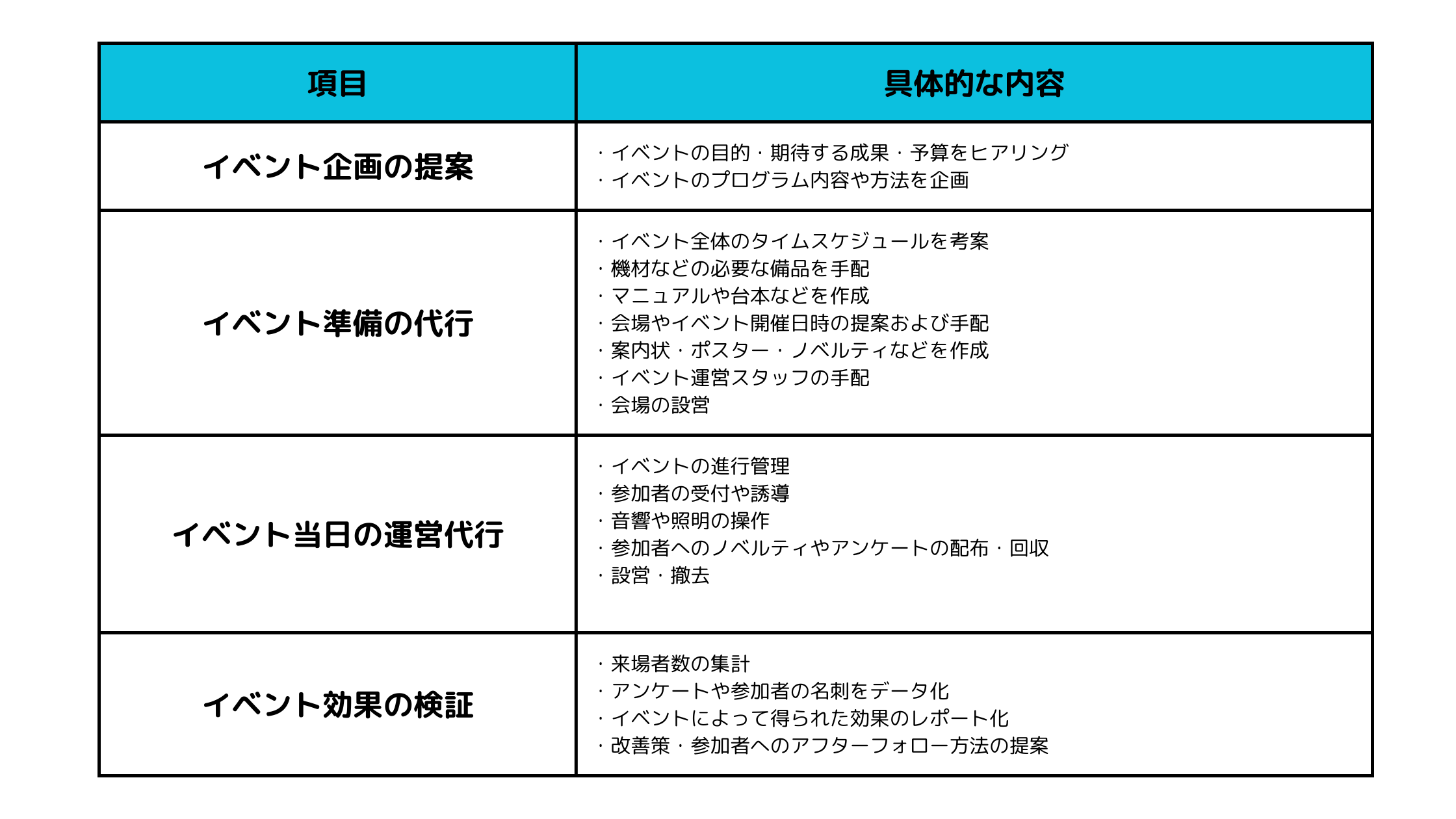 社内イベントや社外イベントの企画や運営を外注できる会社のことを、イベント運営会社といいます。具体的には、以下の業務を委託できる場合が多いです。