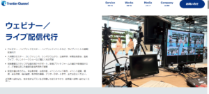 株式会社フロンティアチャンネルは、ウェビナーやハイブリッドイベントなどの運営・配信代行を行っているライブ配信代行業者です。経験豊富なスタッフが、配信プラットフォームの設定や配信設計など、要望に応じたベストな配信方法を提案してくれます。企画段階からアフターサポートまでを一気通貫でサポートしてくれるため、配信ノウハウがない場合でも安心して依頼できるでしょう。